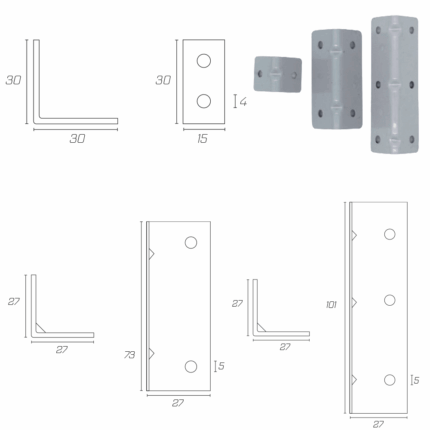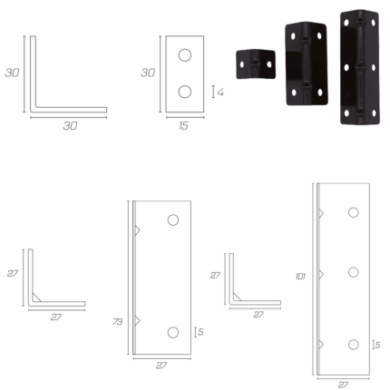 Piezas de refuerzo en forma de “L”, fabricadas en acero con perforaciones a lo largo de sus caras para facilitar su fijación con tornillos o remaches. Diseñado para armar, reforzar y unir muebles de madera, puertas y cuadros.