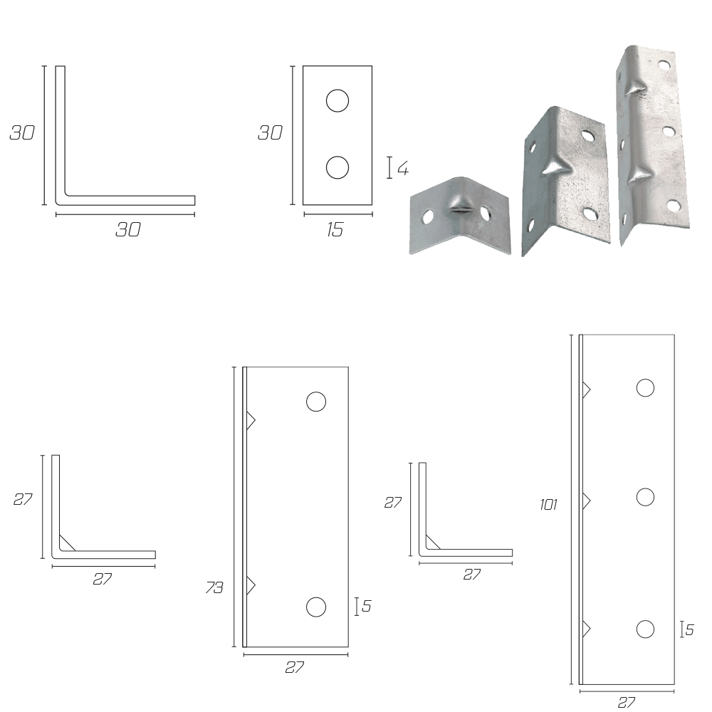 Piezas de refuerzo en forma de “L”, fabricadas en acero con perforaciones a lo largo de sus caras para facilitar su fijación con tornillos o remaches. Diseñado para armar, reforzar y unir muebles de madera, puertas y cuadros.